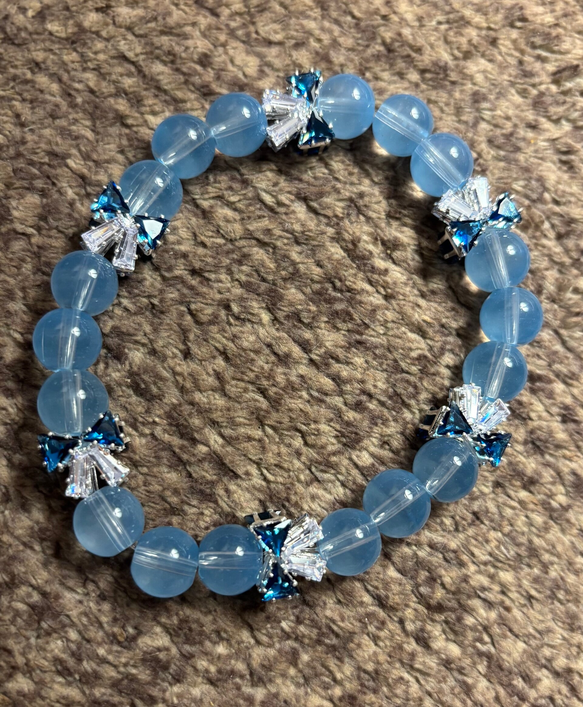 Blue glass beaded bracelet with blue and clear bow diamonds